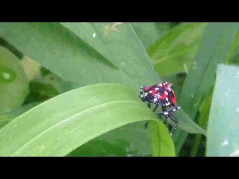 The Spotted Lanternfly nymph are moving in a unique motion as they climb up and down the grass and leaves. Spotted Lanternfly nymph, 斑衣蠟蟬 若蟲, シタベニハゴロモ 若蟲, Lycorma delicatula, 주황날개꽃매미